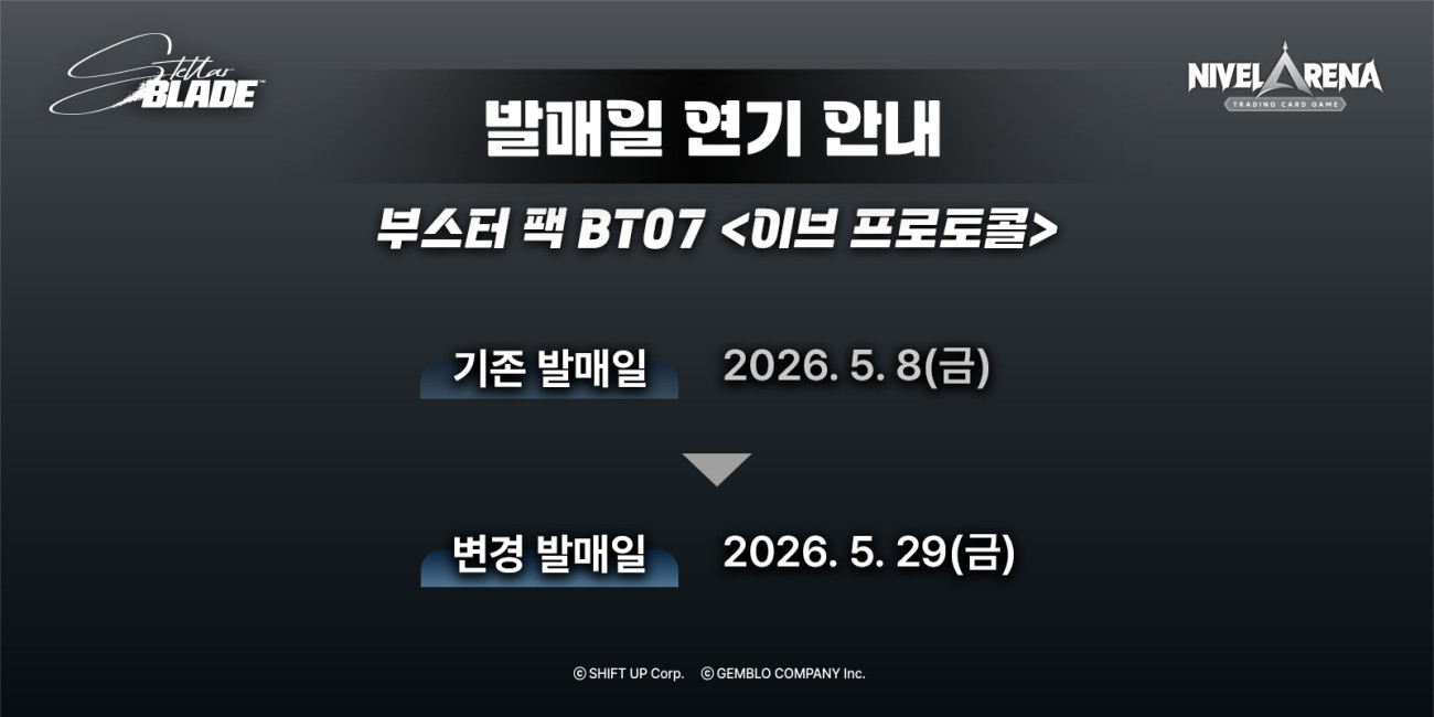 먼저, 스텔라 블레이드 니벨아레나 부스터 팩 BT07 <이브 프로토콜>을 기다려주신 모든 분들께 진심으로 사죄의 말씀을 올립니다.